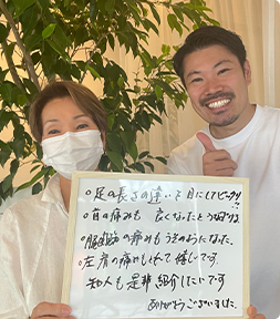 首・股関節・左肩など身体全体に不調を感じていましたが、お世話になり始めてから痛みが取れて本当に嬉しいです。ぜひ、知人にも紹介したいです。