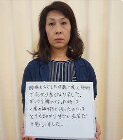 腰痛持ちでずっと痛みを抱えていましたが、週に一度の施術ですっかり楽になりました。しかもぎっくり腰がたった一度の施術で治ったのには、とても助かりました。すごい先生です。