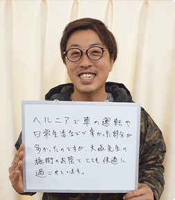 ヘルニアで車の運転や日常生活などで辛かった部分が多かったのですが、大城先生の施術のお陰で、今はとても快適に過ごせています。